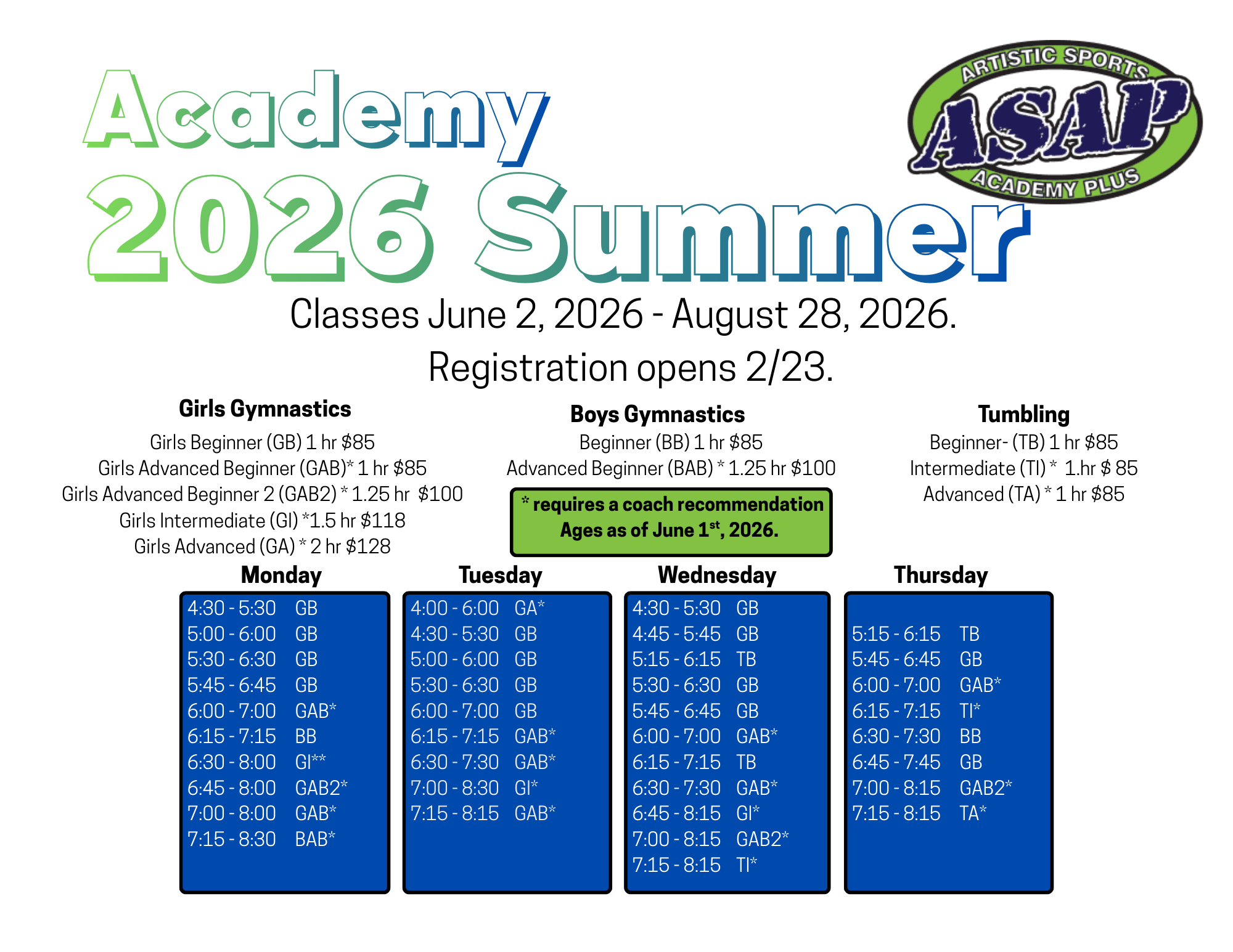 ASAP’s main gymnastics training facility, the Big Gym, is designed for optimal skill learning. The gym is equipped with the latest state of the art training tools and apparatus, which allows our students to safely achieve their goals and work to their highest ability. Classes and instruction are geared by age and ability to ensure safety and proper progression of skills. ASAP staff will work towards your child’s individual level to provide optimal learning.