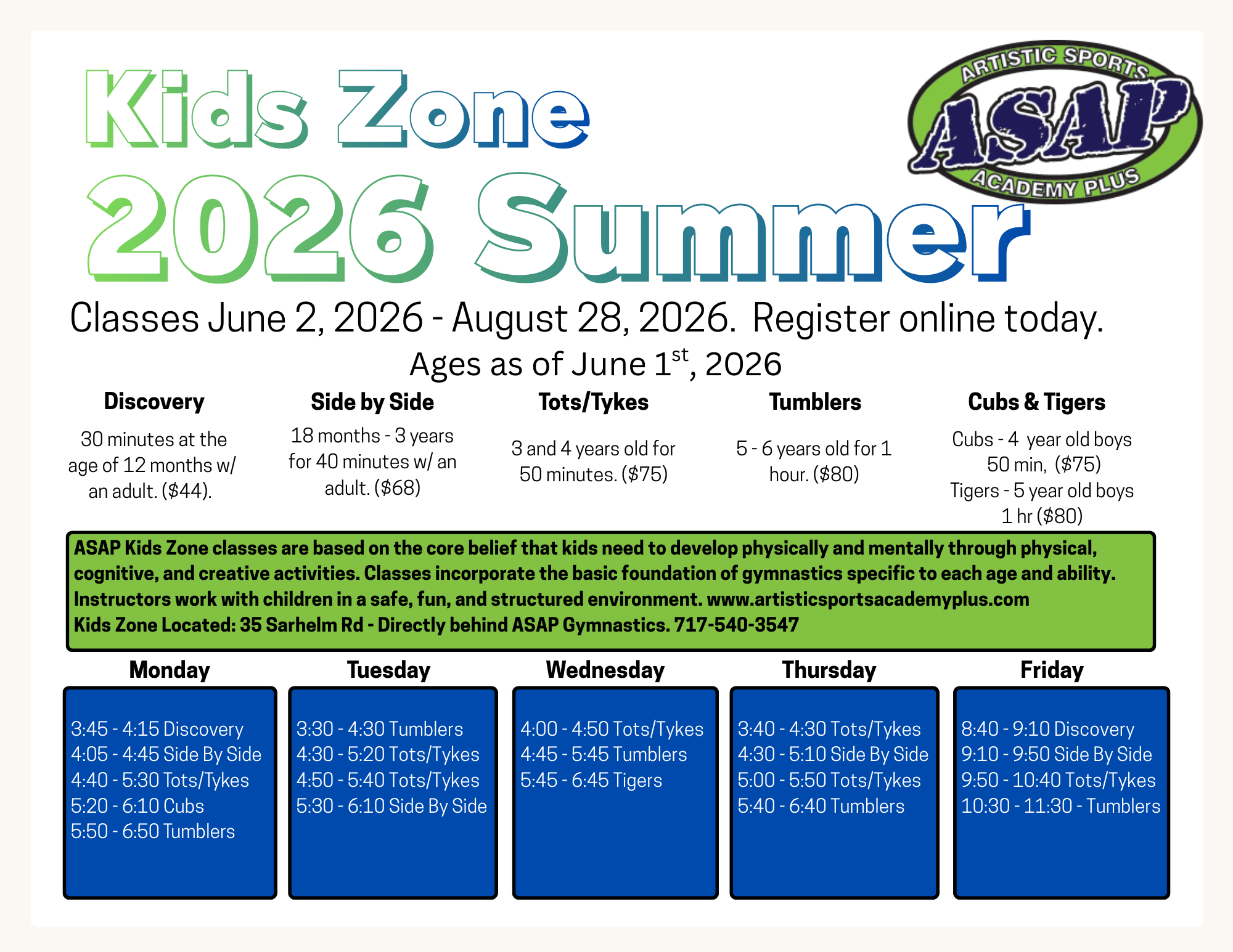 Artistic Sports Academy Plus (ASAP) is a state of the art facility located in the Bradford Village Complex off of Route 22 in Harrisburg, Pennsylvania. ASAP has two facilities. Our Kids Zone facility is for preschool age athletes and is located at Platinum Fitness. Our Academy Program is for those students ages 6 and older interested in gymnastics, tumbling, parkour and competitive gymnastics and is located in our main facility.
